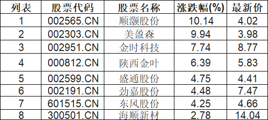 包装材料板块高开,顺灏股份(002565.CN)涨10.14%