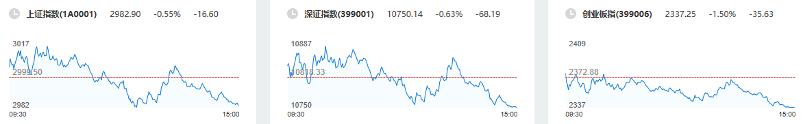 至10月27日收盘,上证综指跌0.55%,报2982.9点;科创50指数涨0.16%,报1004.91点;深证成指跌0.63%,报10750.14点;创业板指跌1.5%,报2337.25点。