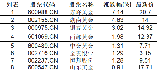 贵金属板块拉升,赤峰黄金(600988.CN)涨7.14%