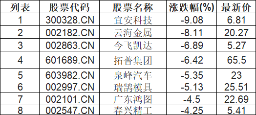 汽车一体化压铸板块下挫,宜安科技(300328.CN)跌9.08%