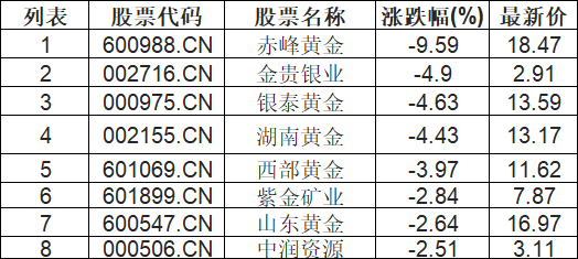 贵金属板块低开,赤峰黄金(600988.CN)跌9.59%