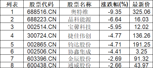 TOPCon电池板块下挫,奥特维(688516.CN)跌9.35%