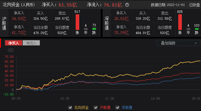 沪深两市超4500只个股上涨,全天成交额9775亿元;北向资金全天净买入61.55亿元,其中沪股通净买入34.93亿元,深股通净买入26.62亿元。
