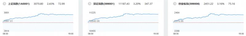 11月4日消息,大盘全天震荡走高,深成指和创业板指均涨超3%,沪指重新站上3000点。盘面上各板块普涨,盐湖提锂板块今日强势领涨,动力电池回收、汽车拆解概念等板块受利好影响大涨,钠离子电池、一体化压铸等板块走高,旅游、饮料、免税店等消费股走强,煤炭、有色金属等周期板块活跃。总体来看,个股呈普涨态势,两市超4100股飘红。截至收盘,沪指报3070.80点,涨2.43%;深成指报11187.43点,涨3.20%;创指报2451.22点,涨3.16%。截至收盘,沪指涨2.43%,深成指涨3.2%,创业板指涨3.16%。