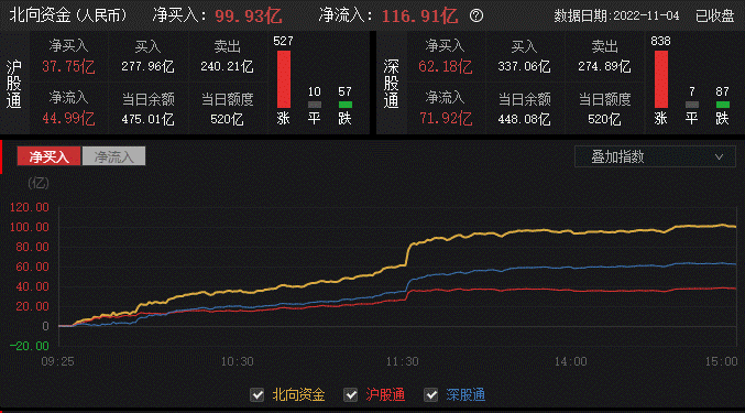 北向资金单边进场,全天大幅净买入99.93亿元,创9月9日以来新高;其中沪股通净买入37.75亿元,深股通净买入62.18亿元。本周北向资金累计减仓逾50亿元。