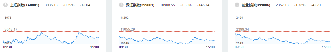 截至收盘,沪指报3036.13点,跌0.39%;深成指报10908.55点,跌1.33%;创指报2357.13点,跌1.76%。
