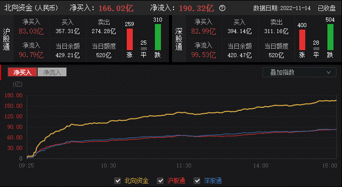 11月14日下午,北向资金全天再度单边净买入166.02亿元,创年内新高,近2个交易日累计加仓超310亿元。其中,沪股通净买入83.03亿元,深股通净买入82.99亿元。