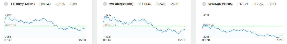 截至收盘,沪指报3083.40点,跌0.13%;深成指报11113.46点,跌0.24%;创指报2375.21点,跌1.25%。盘面上,中药、医药电商、医药商业板块涨幅居前;机场航运、供销社、TOPCON电池板块跌幅居前。