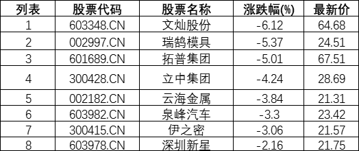汽车一体化压铸板块下挫,文灿股份(603348.CN)跌6.12%