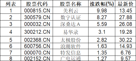 国资云概念板块拉升,美利云(000815.CN)涨9.98%