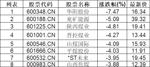 煤炭行业板块下挫,华阳股份(600348.CN)跌7.47%