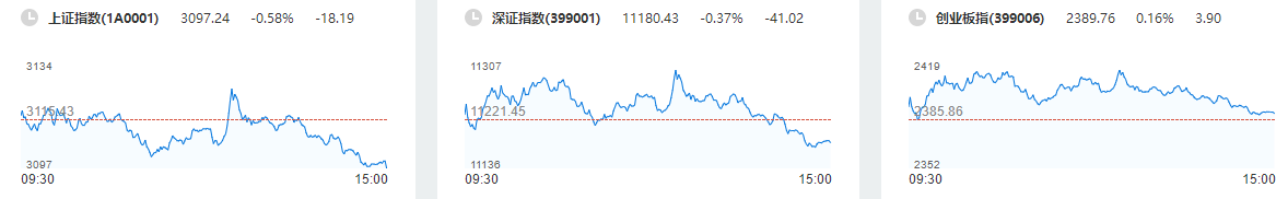 截至收盘,沪指报3097.24点,跌0.58%;深成指报11180.43点,跌0.37%;创指报2389.76点,涨0.16%。盘面上,教育、生物制品、新冠治疗板块涨幅居前;汽车芯片、半导体、供销社板块跌幅居前。