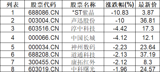 计算机设备板块下挫,*ST紫晶(688086.CN)跌10.83%