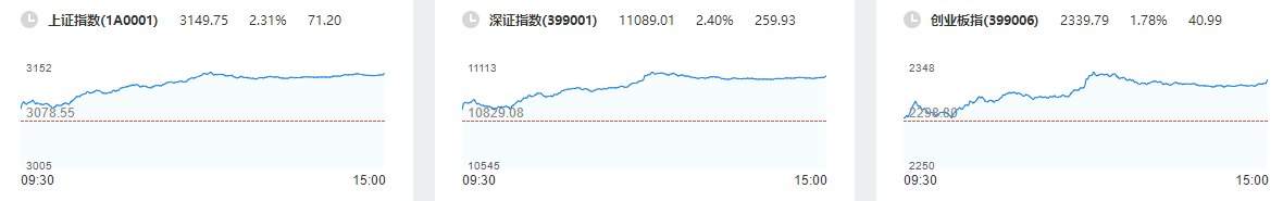 截至收盘,沪指涨2.31%,报3149.75点,深成指涨2.4%,报11089.01点,创业板指涨1.78%,报2339.79点,科创50指数涨0.97%,报1002.45点。沪深两市合计成交额9681.19亿元,北向资金实际净买入98.06亿元。两市114股涨停(含ST股),1股跌停。