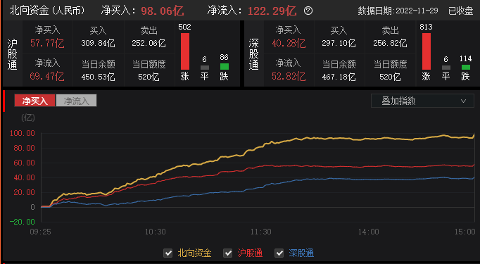 北向资金方面,截至沪深股市收盘,北向资金净买入98.06亿元,沪股通净买入57.77亿元,深股通净买入40.28亿元。