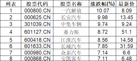 截至10:45,汽车整车板块拉升。一汽解放(000800.CN)涨10.07%报8.09元,长安汽车(000625.CN)涨9.98%报13.45元,中集车辆(301039.CN)涨9.74%报9.24元,赛力斯(601127.CN)涨8.72%报51.1元,江淮汽车(600418.CN)涨8.56%报14.58元,长城汽车(601633.CN)涨7.85%报31.59元,众泰汽车(000980.CN)涨7.14%报6.6元,安凯客车(000868.CN)涨7.11%报6.48元。