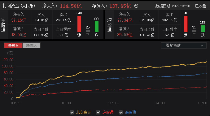 12月1日,截至A股收盘,北向资金合计净买入114.5亿元,创11月14日以来新高;其中沪股通净买入37.16亿元,深股通净买入77.34亿元。北向资金成交金额1253.23亿元,占A股总成交额11.84%,交易活跃度下降6%。