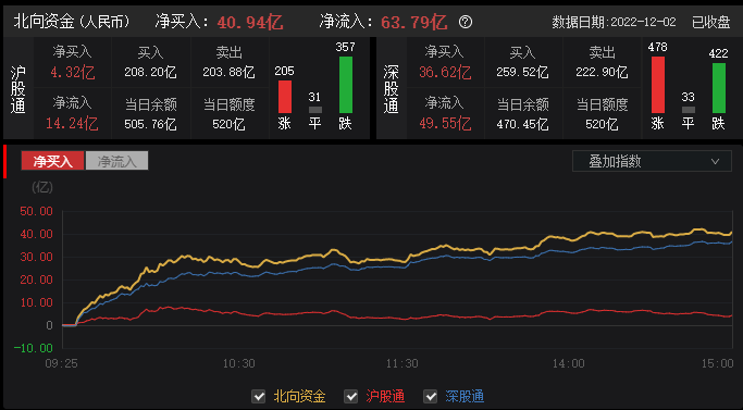 12月2日,截至A股收盘,统计数据显示北向资金合计净买入40.94亿元,其中沪股通净买入4.32亿元,深股通净买入36.62亿元。北向资金保持连续4日净买入,净买入额分别为98.06亿元、49.17亿元、114.50亿元、40.94亿元,合计净买入302.67亿元。