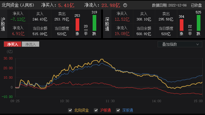 北向资金午后缓慢离场,全天小幅净买入5.41亿元,连续6日加仓A股;其中沪股通净卖出7.12亿元,深股通净买入12.52亿元。