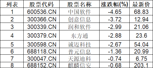截至13:15,华为欧拉板块下挫。中国软件(600536.CN)跌4.65%报68.83元,创意信息(300366.CN)跌3.72%报12.94元,润和软件(300339.CN)跌2.99%报21.06元,东方通(300379.CN)跌2.88%报23.6元,诚迈科技(300598.CN)跌2.67%报54.04元,普元信息(688118.CN)跌1.36%报20.99元,天源迪科(300047.CN)跌0.74%报6.75元,麒麟信安(688152.CN)跌0.68%报203.1元。