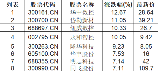 通用设备板块拉升,华中数控(300161.CN)涨12.67%
