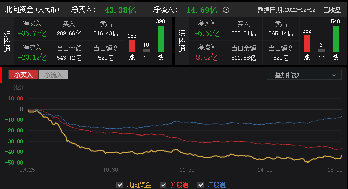 12月12日沪指下跌0.87%,北向资金合计买入成交468.20亿元,卖出成交511.57亿元,合计成交额979.77亿元。全天成交净卖出43.37亿元,其中,沪股通合计成交额456.09亿元,成交净卖出36.77亿元;深股通合计成交523.68亿元,成交净卖出6.60亿元。