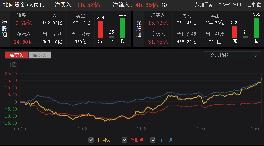 北向资金盘中呈流出态势,尾盘积极抢筹,全天净买入16.52亿元,结束连续3日净卖出;其中,沪股通今日净买入0.79亿元,深股通净买入15.72亿元。