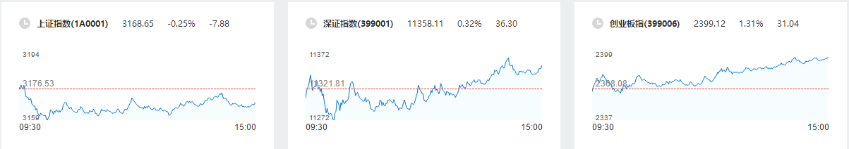 15日,A股三大股指开盘涨跌不一,随后沪指弱势震荡下探,创业板指、科创50指数盘中强势拉升,但临近午盘涨幅收窄,午后,创业板指继续上攻,终盘涨超1%。行业板块涨跌互现,多数个股收涨,近2800股上涨。北向资金净买入近50亿元。截至收盘,沪指跌0.25%报3168.65点,深成指涨0.32%,创业板指涨1.31%;两市合计成交7662亿元,北向资金净买入49.36亿元。