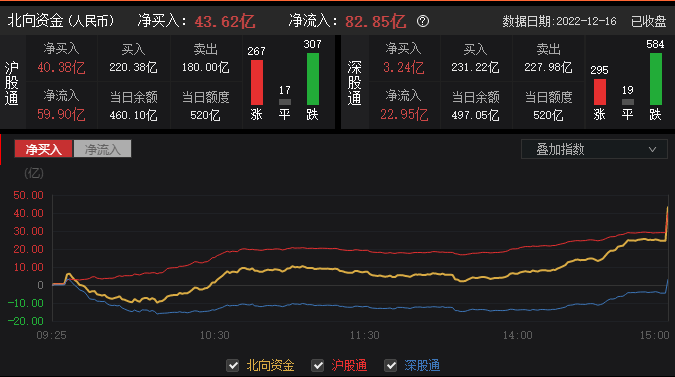 12月16日,沪指盘中冲高回落,午后弱势窄幅震荡,临近尾盘拉升,接近翻红;深成指、创业板指走势疲弱,创业板指跌超1%;两市成交约7600亿元,北向资金尾盘加速进场,全日净买入超40亿元。截至收盘,沪指微跌0.02%报3167.86点,深成指跌0.56%报11295.03点,创业板指跌1.06%报2373.72点;两市合计成交7614亿元,北向资金净买入43.62亿元。