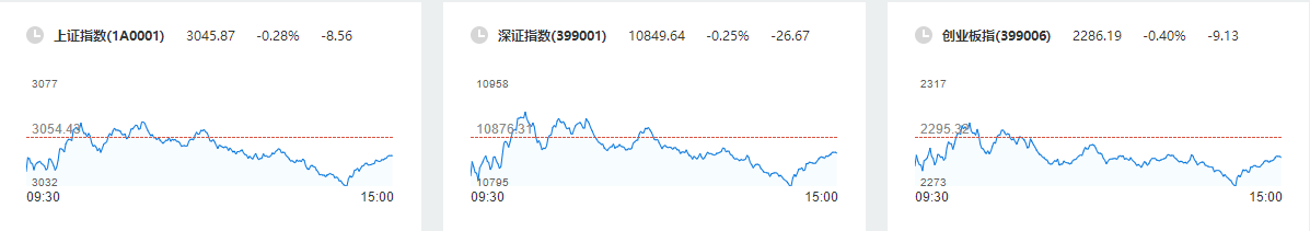 周五A股三大指数集体低开,早盘市场短暂反弹翻红后震荡,三大指数午间收盘涨跌不一;午后市场进一步下探,沪指一度跌破前低3034.7点创逾一个月新低,今日两市成交额再度低于6000亿元。值得关注的是,本周A股三大指数集体连跌五日。截至收盘,沪指跌0.28%,报3045.87点,深成指跌0.25%,报10849.64点,创业板指跌0.4%,报2286.19点,科创50指数跌1.12%,报920.35点。沪深两市合计成交额5853.79亿元,两市45股涨停(含ST股),27股跌停。注:因圣诞节假期将至,北向沪股通和深股通将于12月23日至27日暂停交易。