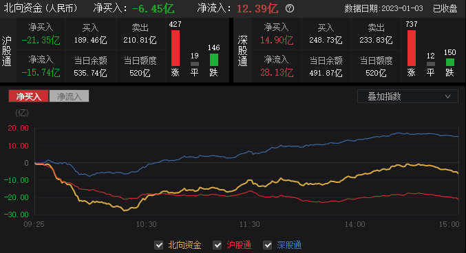 北向资金全天小幅净卖出6.45亿元,其中沪股通净卖出21.35亿元,深股通净买入14.9亿元。