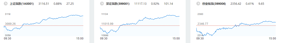 2023年A股市场迎来开门红,早盘A股小幅低开,盘初半小时三大指数下行走弱,创业板指一度跌超1%,十点后市场止跌反弹,沪指、深成指相继翻红,创业板指跌幅收窄,午前沪指收复3100点,创业板指跟随翻红。午后A股进一步走高,沪指涨近1%,另外科创50指数涨逾2%。