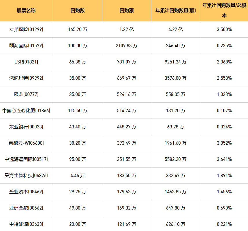 5月15日港股回购概况:和谐汽车(03836)、天福(06868)、摩比发展(00947)、昊海生物科技(06826)、友邦保险(01299)、东亚银行(00023)、新时代能源(00166)、百融云-W(06608)、泡泡玛特(09992)、盛业资本(08469)、京信通信(02342)、网龙(00777)、亚洲金融(00662)、中裕能源(03633)、赛晶科技(00580)、现代牙科(03600)、中国心连心化肥(01866)、乐声电子(00213)、中远海运国际(00517)、创胜集团-B(06628)、颐海国际(01579)、天工国际(00826)、康圣环球(09960)、ESR(01821)、彩客新能源(01986)于2023年5月12日进行了回购。其中,回购金额最大的为友邦保险(01299),回购数量165.20 万,回购金额1.32 亿元。