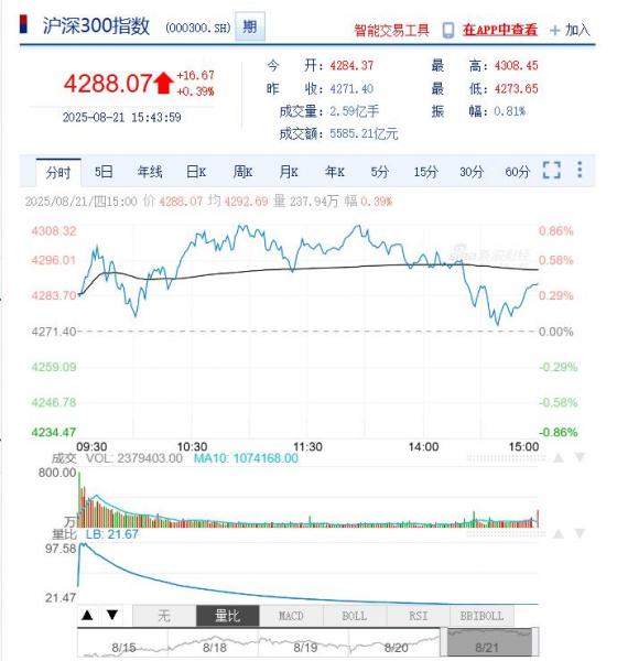 A股收盘情况 A股今日延续强势表现,沪指一举突破3800点,再创十年新高。截止收盘,沪指涨1.45%,收报3825.76点;深证成指涨2.07%,收报12166.06点;创业板指涨3.36%,收报2682.55点;科创50指数涨8.59%,收报1247.86点。沪深两市成交额达到25467亿,较昨日放量1227亿。 北向资金净流入情况 8月21日