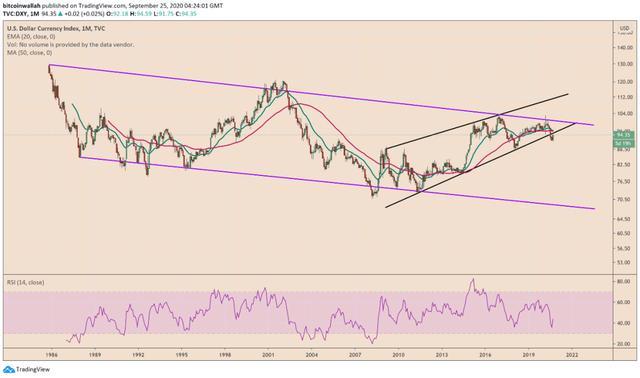 美元指数(DXY)是衡量其相对于一篮子主要外币表现的晴雨表,其月度图表显示,美元仍然处于下行趋势。这样看来,该指数在下行通道内一直在下行,由两个以上的低高点和低低点证实了这一预测。