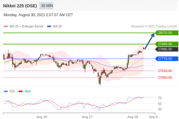 交易策略: 在 27770.00 之上,看涨,目标价位为 27940.00 ,然后为 28070.00 。