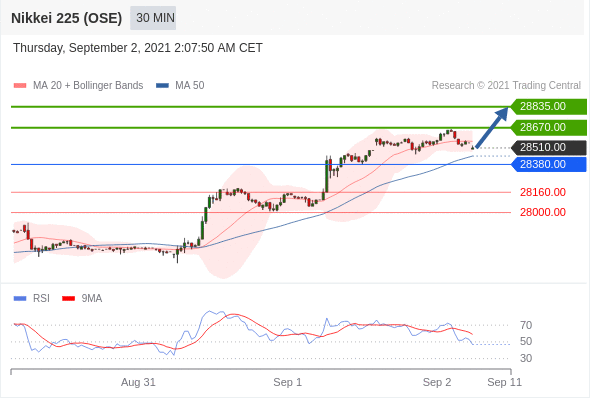 交易策略: 在 28380.00 之上,看涨,目标价位为 28670.00 ,然后为 28835.00 。