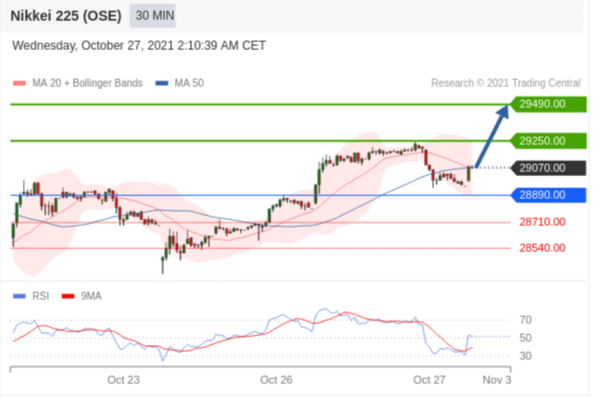 在 28890.00 之上,看涨,目标价位为 29250.00 ,然后为 29490.00 。