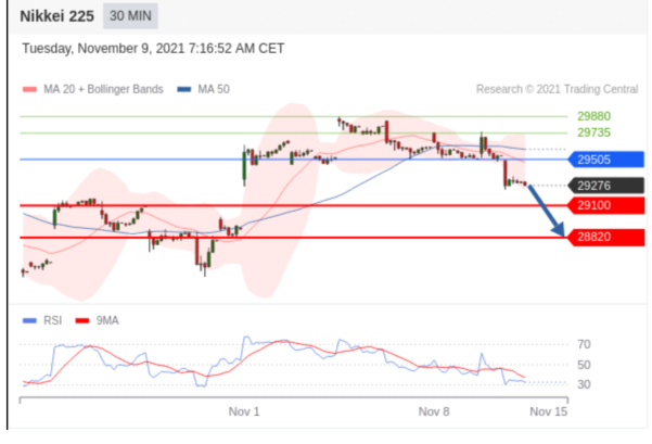 Nikkei 225 当日内交易策略: 在 29505 之下 目标价位为 29100 (20211109)