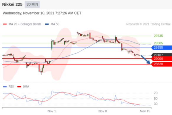 Nikkei 225 当日内交易策略: 在 29355 之下 目标价位为 29000(20211110)