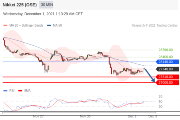交易策略: 在 28140.00 之下,看跌,目标价位为 27310.00 ,然后为 27000.00 。