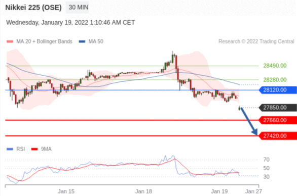 交易策略: 在 28120.00 之下,看跌,目标价位为 27660.00 ,然后为 27420.00 。