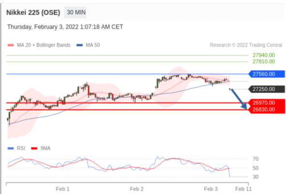 在 27560.00 之下,看跌,目标价位为 26970.00 ,然后为 26830.00 。