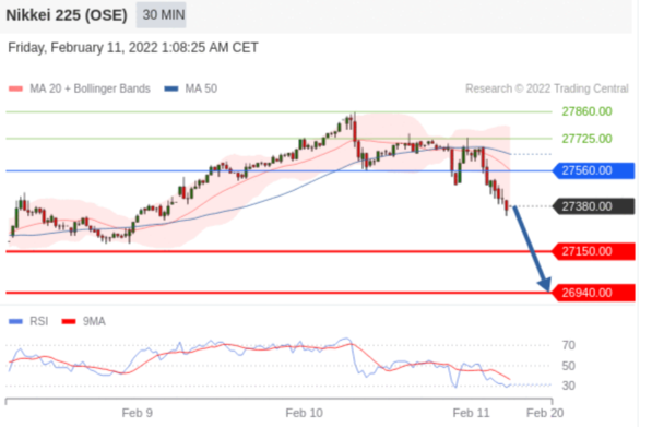 交易策略: 在 27560.00 之下,看跌,目标价位为 27150.00 ,然后为 26940.00 。