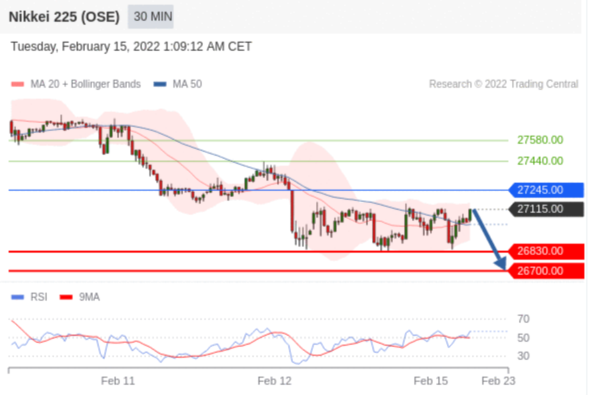 交易策略: 在 27245.00 之下,看跌,目标价位为 26830.00 ,然后为 26700.00 。