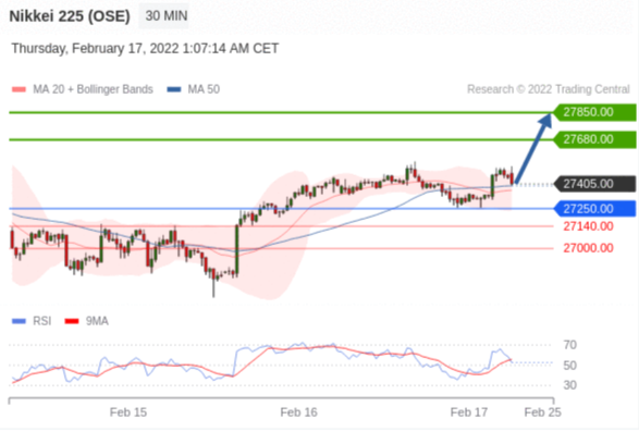 交易策略: 在 27250.00 之上,看涨,目标价位为 27680.00 ,然后为 27850.00 。