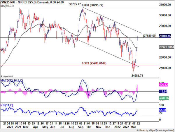 从更大的角度来看,16358.19至30795.77的38.2%回撤位在25280.61被视为已经得到扞卫,尽管本月早些时候出现了短暂的突破。突破55周EMA也是一个积极的迹象。从16358.19上涨的趋势可能准备在下个季度恢复。