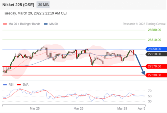 交易策略: 在 28050.00 之下,看跌,目标价位为 27570.00 ,然后为 27330.00 。