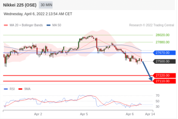 在 27670.00 之下,看跌,目标价位为 27220.00 ,然后为 27110.00 。