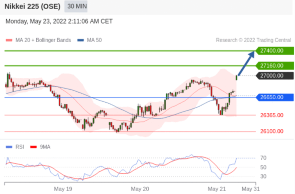 日经225股指期货 (OSE) (M2) 当日内交易策略:在 26650.00 之上 目标价位为 27160.00(20220523)